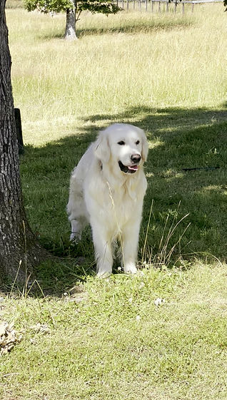 Banks joined our family in 2022 as a big fluffy white puppy from Louisiana. He is the softest golden retriever I have ever been around. Banks loves to lean in for hugs and sit on your feet. He's a big friendly guy with a beautiful cream (almost white) coat. He loves his ladies, but Banks' best friend is our Hereford cow, Rosie. They hang out together a lot and it's not uncommon to see Rosie licking and loving all over Banks' face!